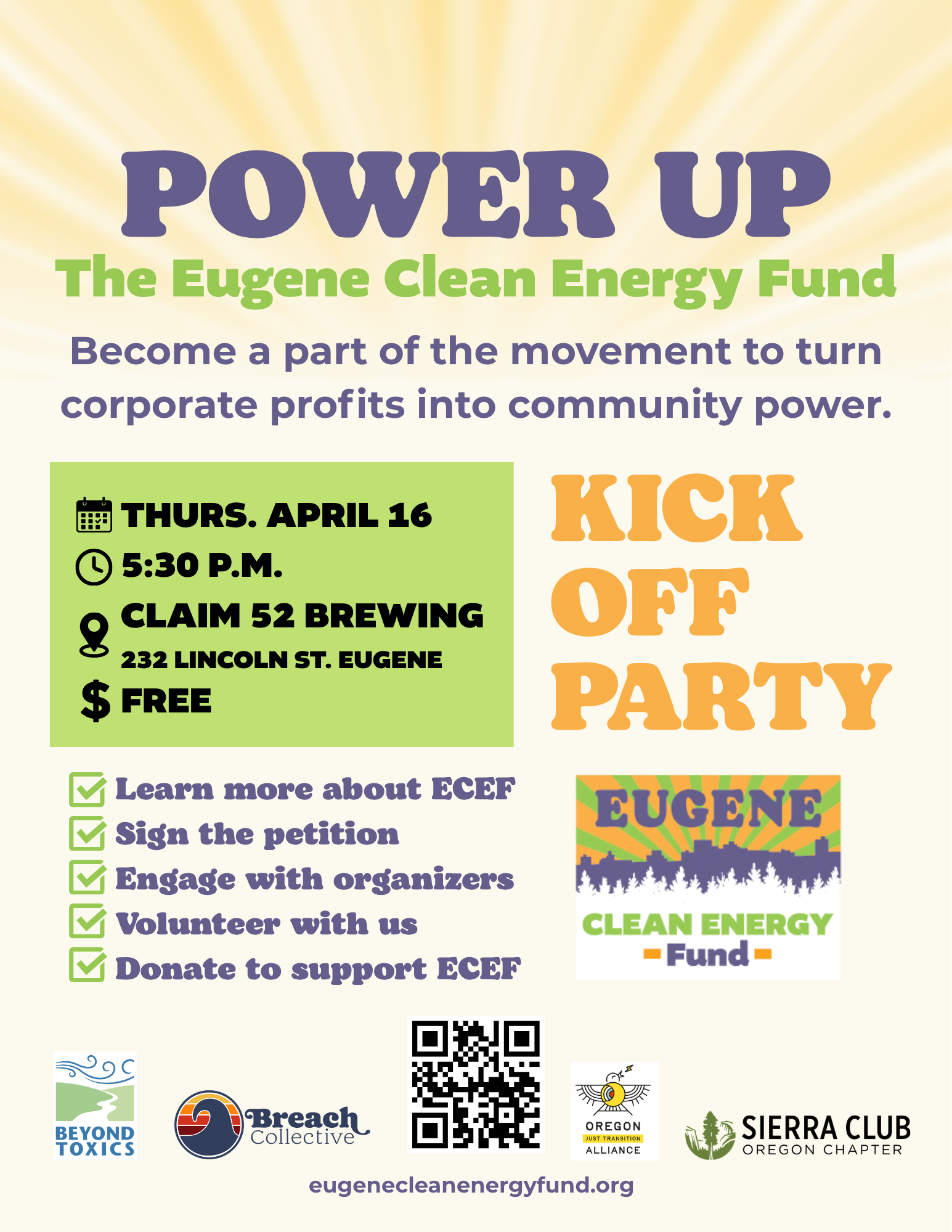 It’s time to celebrate the official launch of Eugene Clean Energy Fund! Join Beyond Toxics, Breach Collective, Oregon Just Transition Alliance, and Sierra Club Oregon Chapter to learn more about ECEF, sign the petition, meet the organizers, and learn hiw you can volunteer and support the initiative.